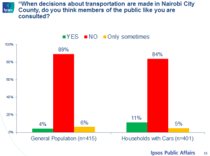 First, the poll shows that Nairobians clearly do not feel that they are consulted in transportation decision-making. When asked “when decisions about transportation are made in Nairobi City County, do you think members of the public like you are consulted?” 89% said no. Mr Martin Eshiwani of the Ministry of Transportation and Infrastructure who attended the release conceded that more could be done to connect with the public. The opinion poll, which is becoming more common as a tool for planners, piqued his interest.
